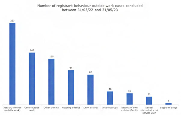In the 12 months from 31 May 2022 to 31 May 2023 we concluded 759 registrant fitness to practise cases that were about behaviour outside of work, which is 24% of all registrant cases concluded.