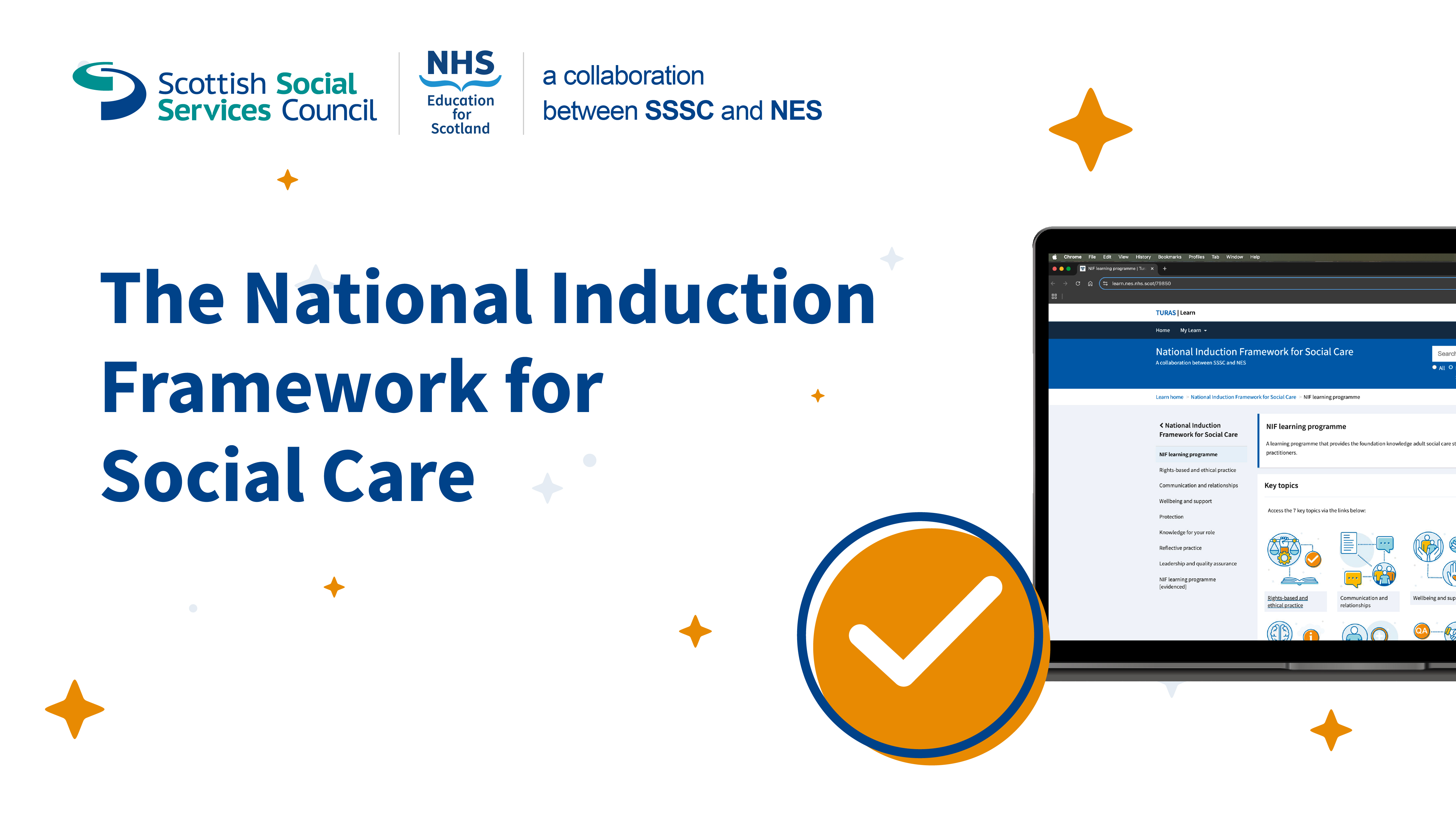 Development work has included extensive collaboration with the sector to align content with National Occupational Standards (NOS) and the Scottish Vocational Qualifications (SVQs). Stakeholder input emphasised quality and legal compliance for staff training. NES and the SSSC created the Turas Learn National Induction Learning Zone to host content and provide completion certificates when the programme of learning is complete.