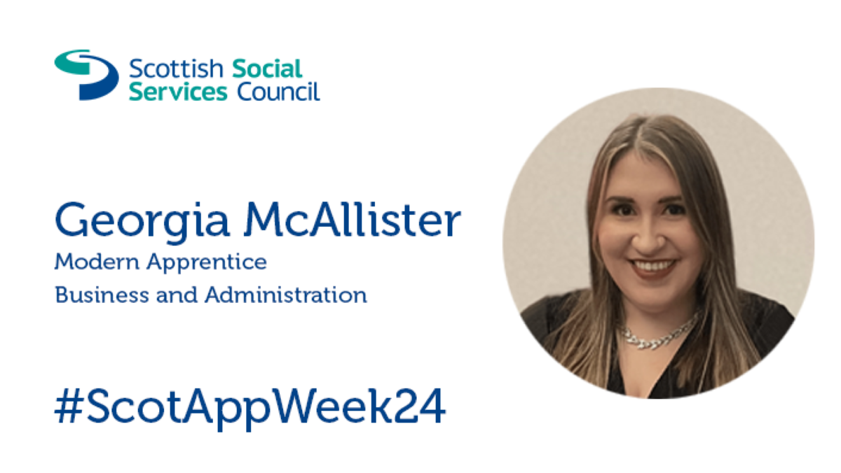 Georgia is now employed by the Scottish Social Services Council (SSSC) and Care Inspectorate in our shared Human Resources Team as an HR Assistant. She joined the team in 2020 as a Modern Apprentice in Business and Administration.